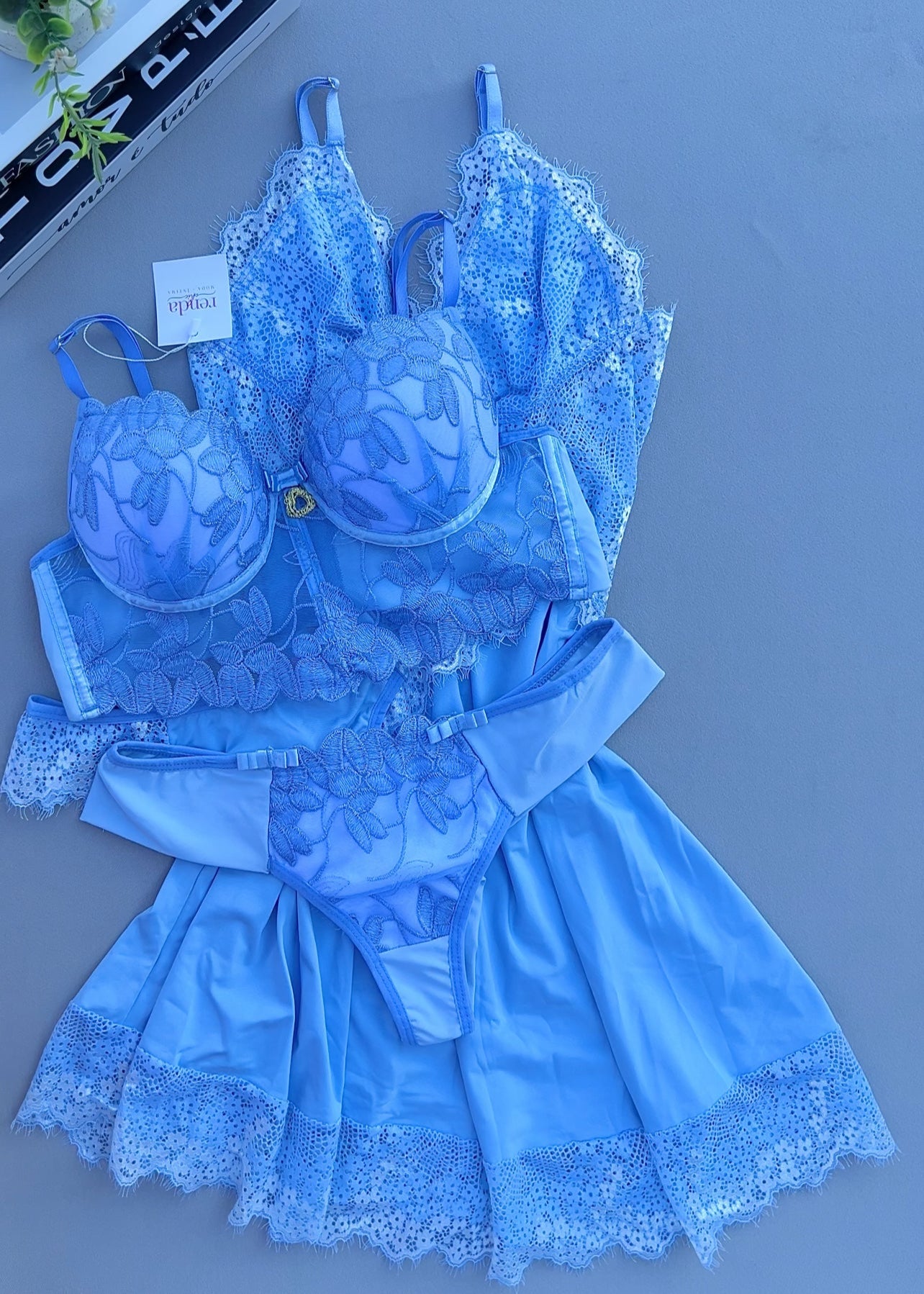 Édition Blue and Off-White — Combo 4 peças: Camisola + Calcinha +Conjunto Elisée