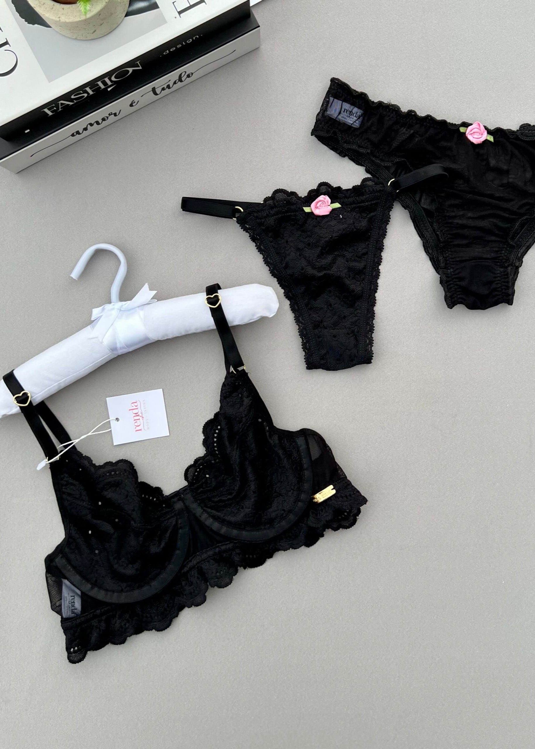 O sutiã, sem bojo e com aro sutil, tem o equilíbrio perfeito entre sustentação e leveza. Já a renda laise com toque artesanal transforma a peça em uma joia íntima, com visual romântico e atemporal.
