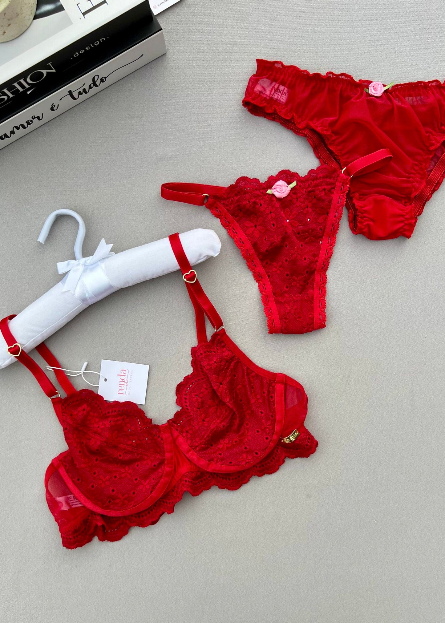 - Kit com 3 peças: sutiã + calcinha string + calcinha fru-fru