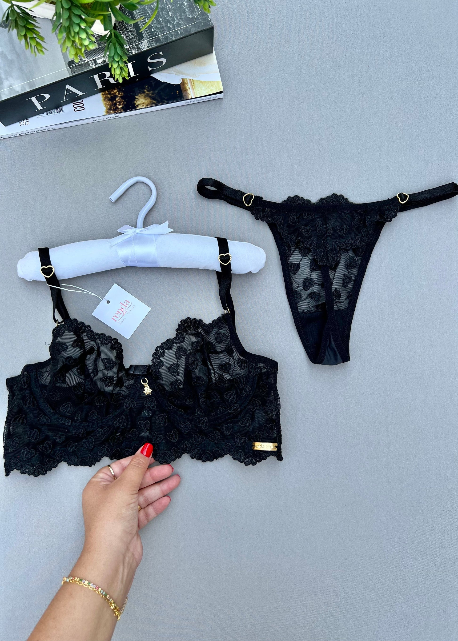 Conjunto Douce Désiré Black - Tule Bordado com corações