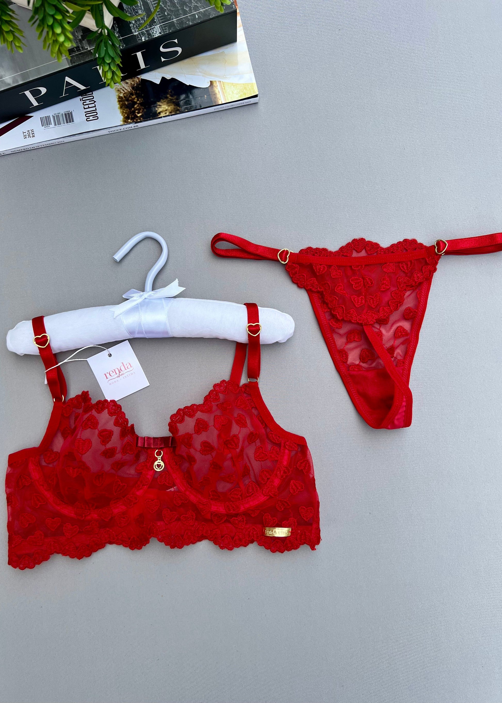 Conjunto Douce Désiré Rouge - Tule Bordado com corações