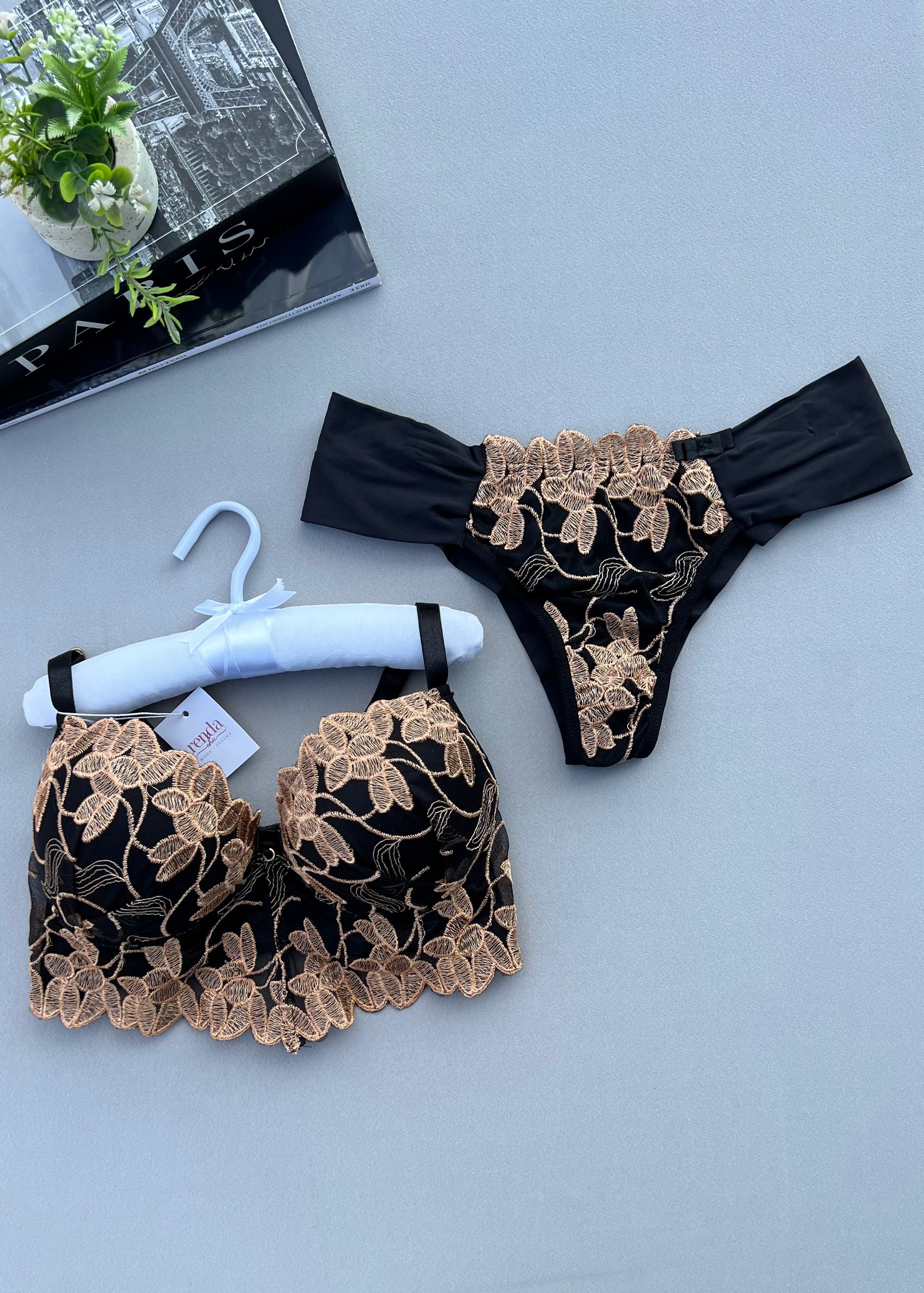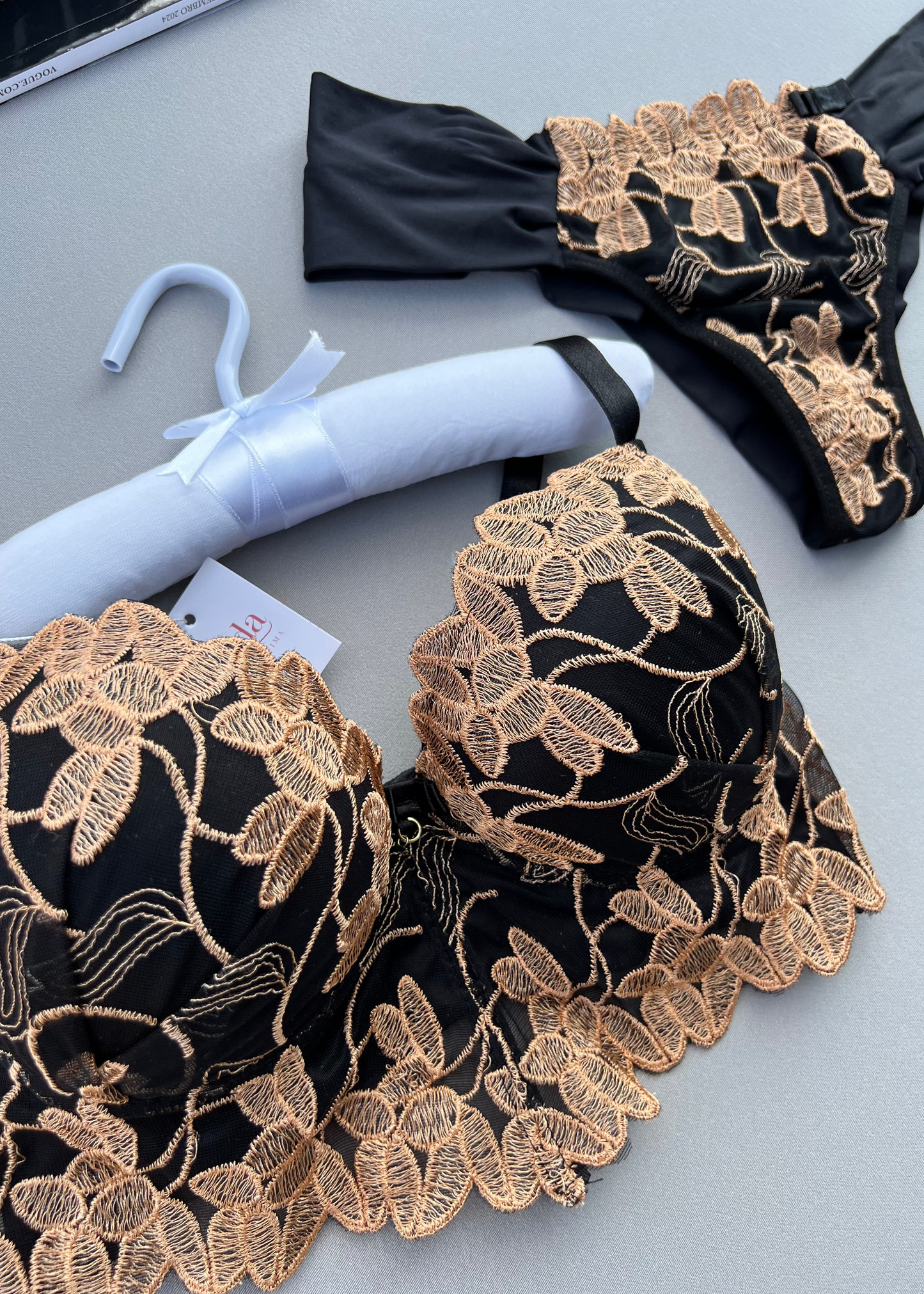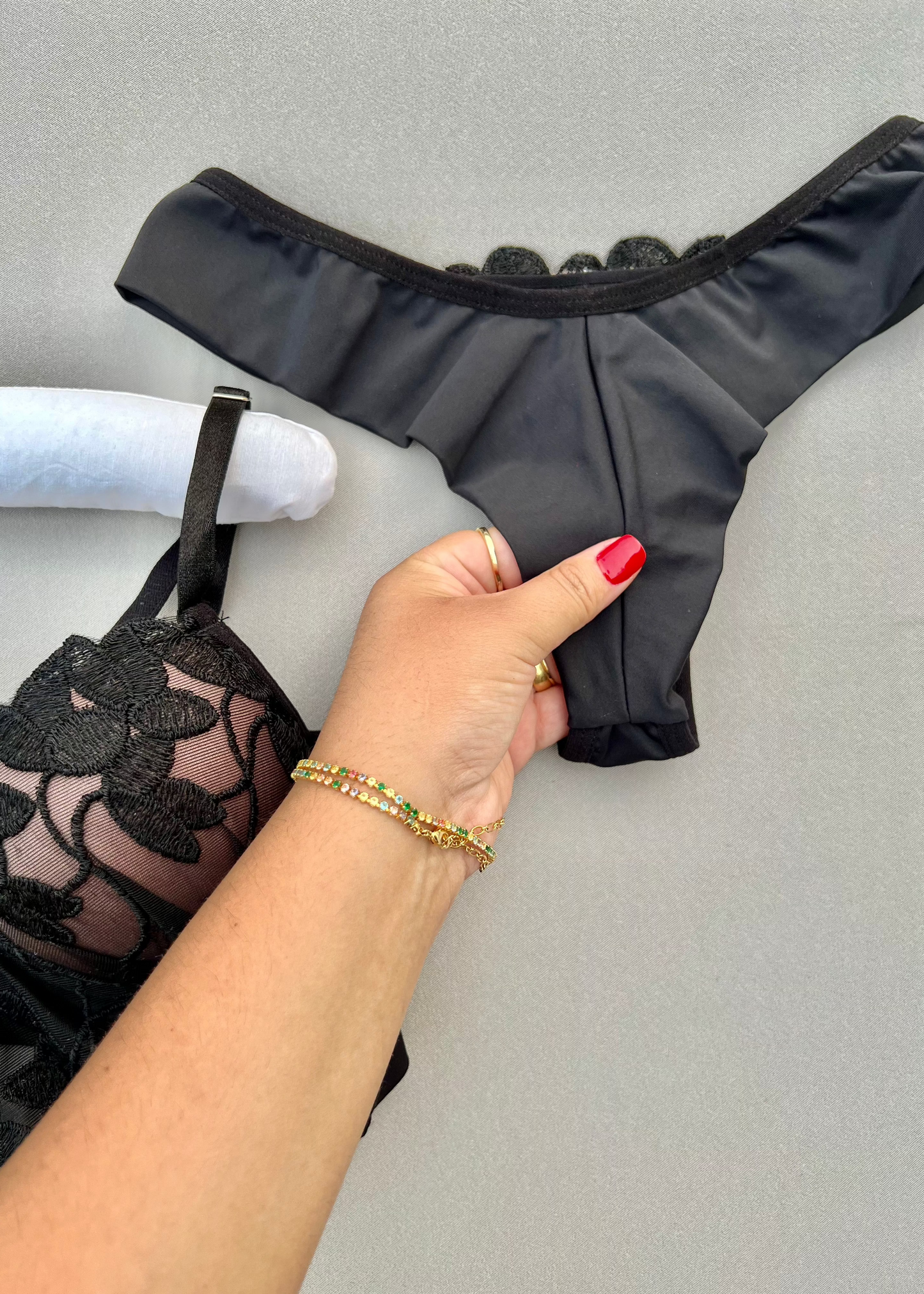 O sutiã oferece sustentação com conforto e presença. A calcinha semi fio traz sensualidade equilibrada, com forro 100% algodão e um toque de luxo discreto.