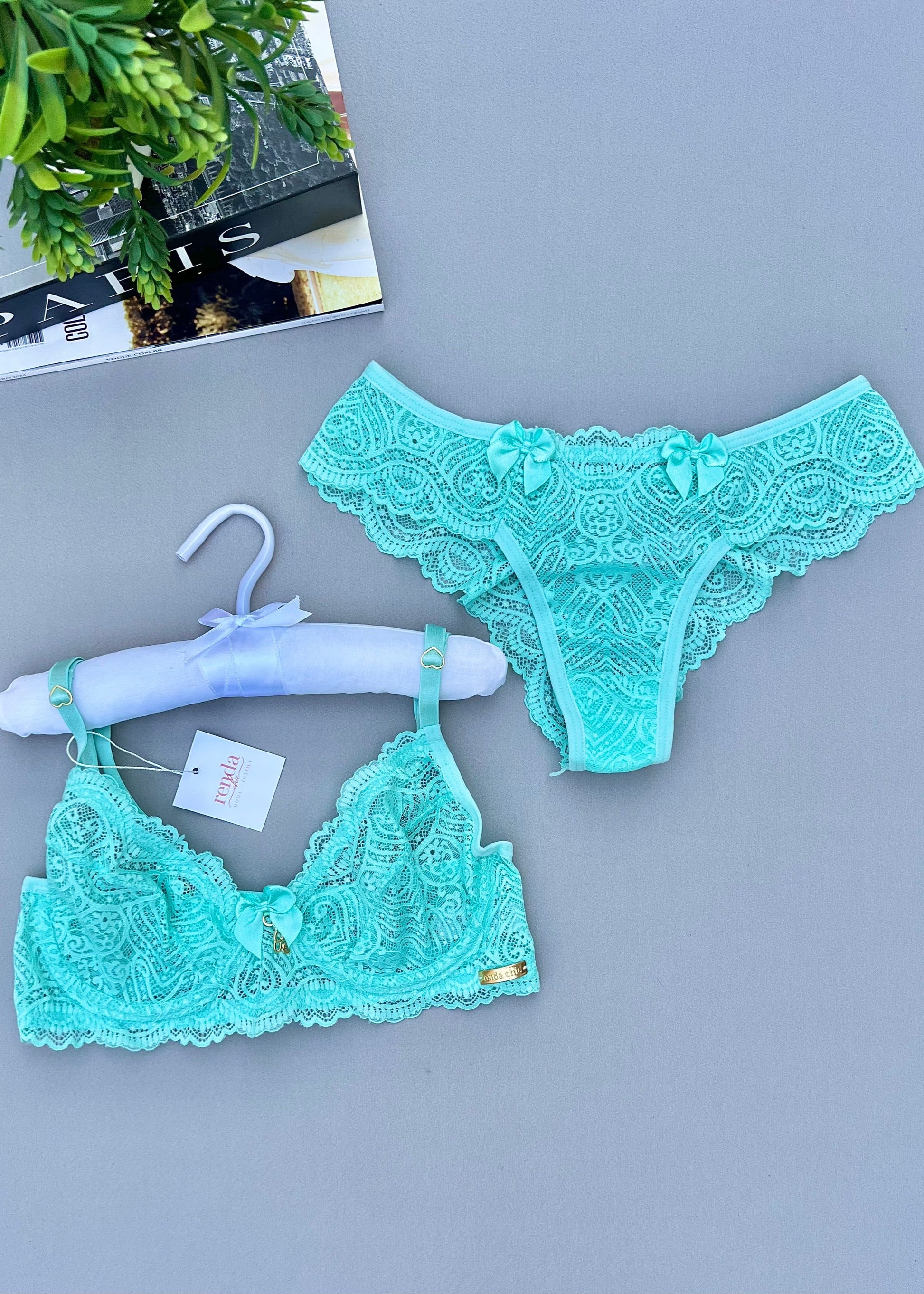 Conjunto Jolie Dentelle Vert Clair - Em renda, detalhe frontal com laço de cetim