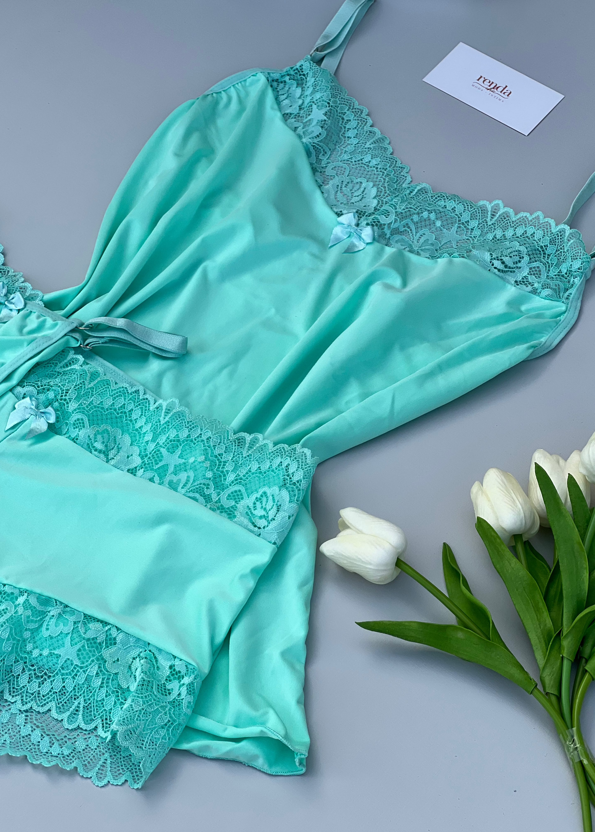 Um encontro delicado entre conforto e feminilidade. O Édition Mint Green traz duas peças essenciais para noites leves e dias com charme natural: o conjunto de pijama curto e o Conjunto Amour Champêtre