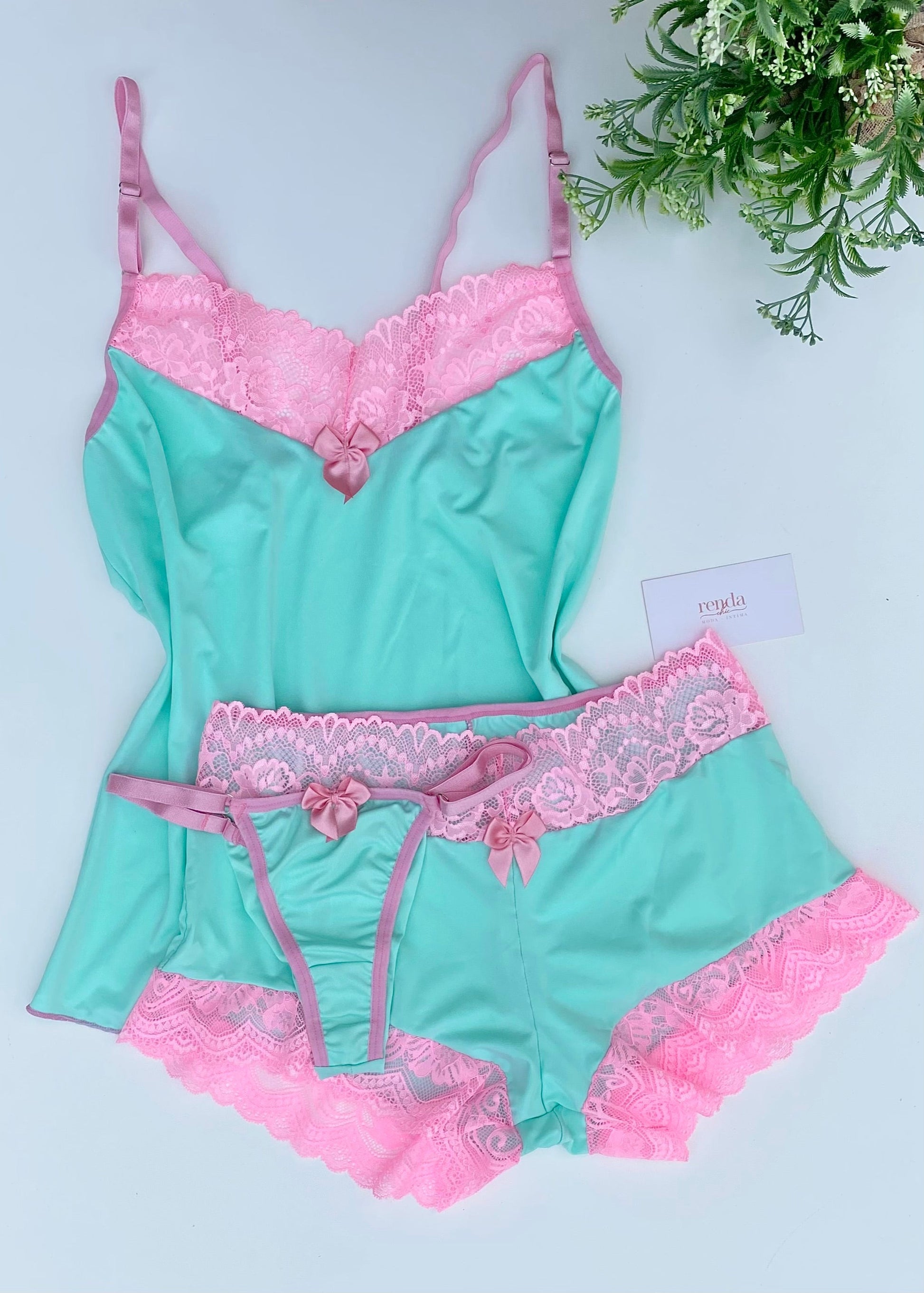 Conjunto de pijama curto + calcinha - Mint Green and Bubbaloo Pink